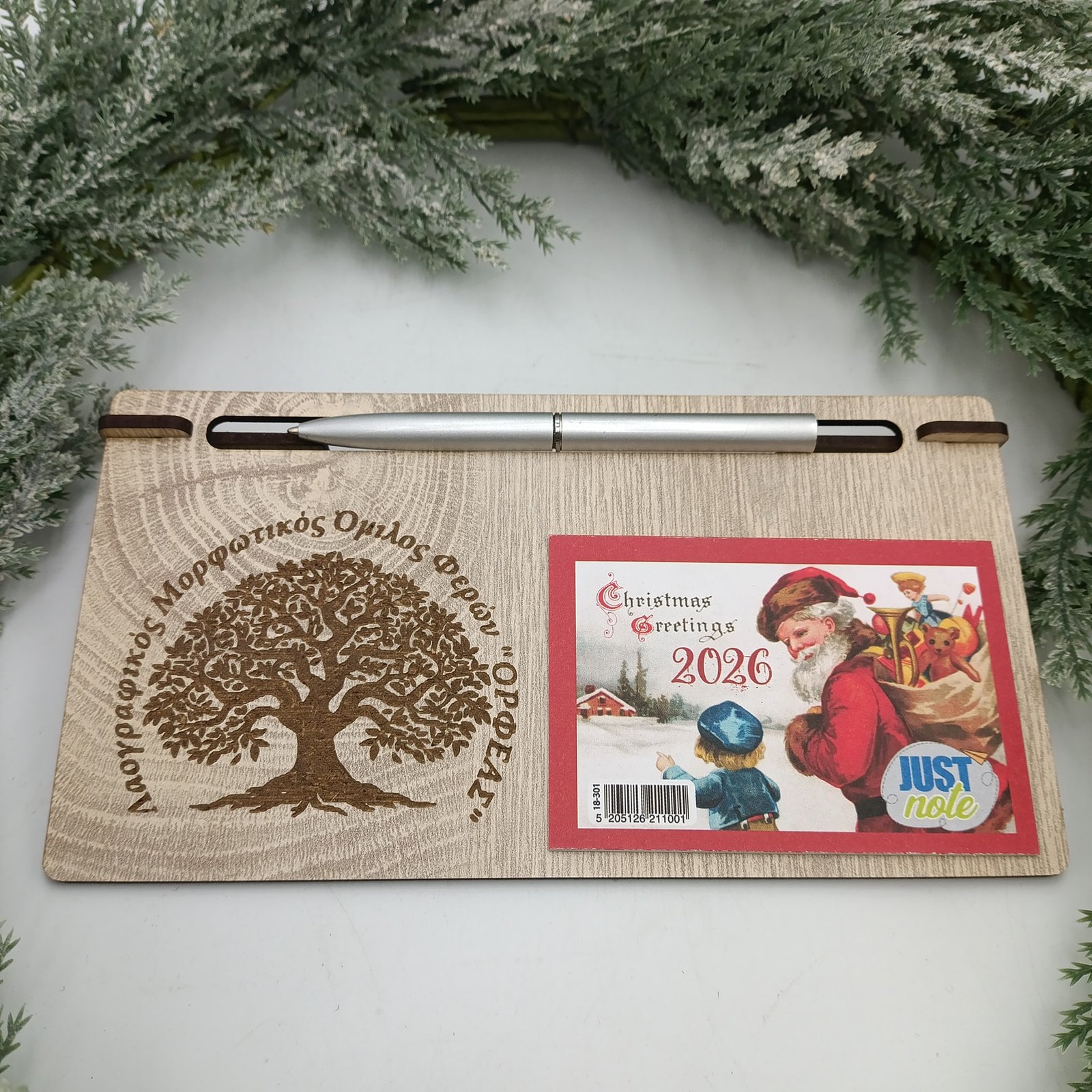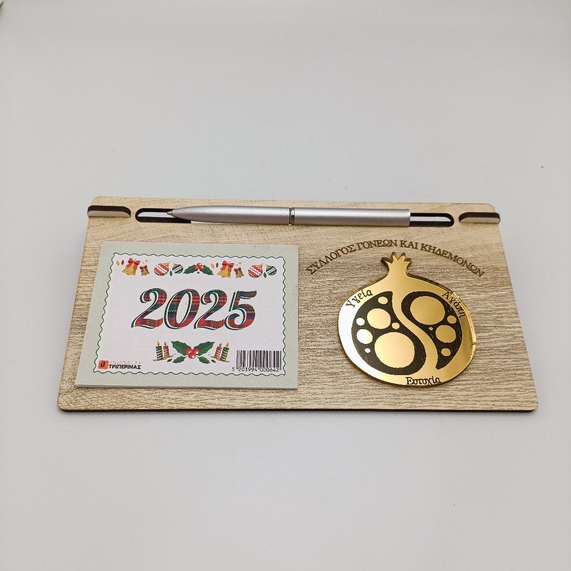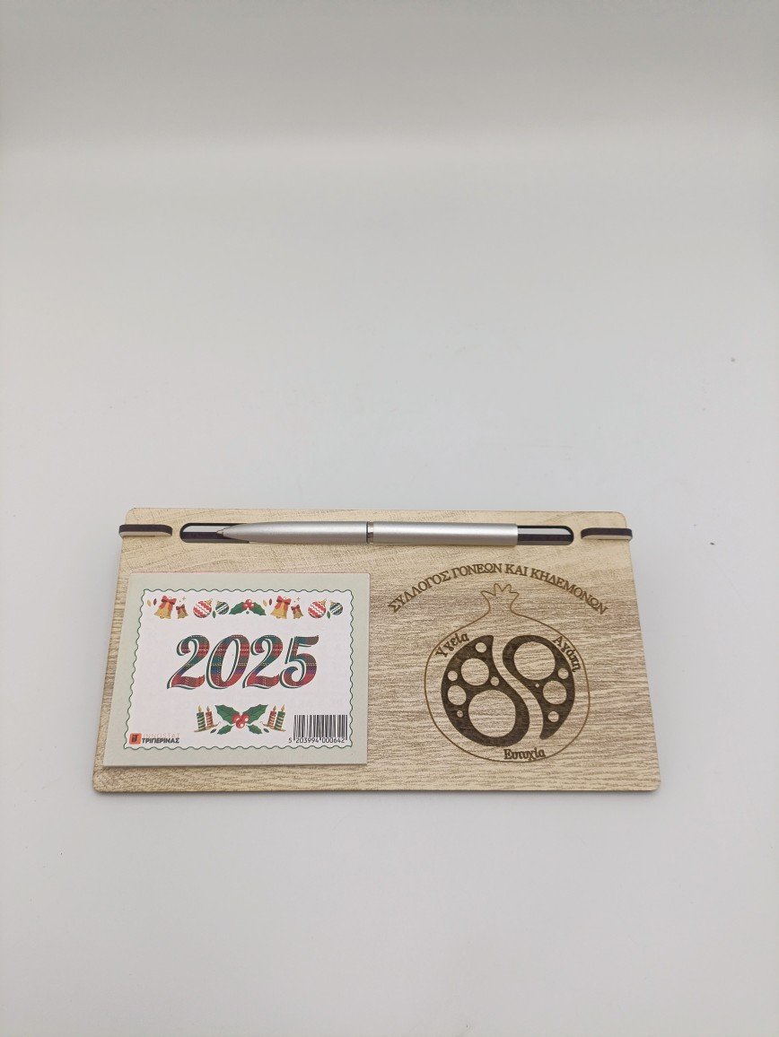 Επιτραπέζιο ημερολόγιο με βάση και θήκη στυλό. Στείλτε μας το λογότυπο ή το σχέδιο που θα θέλατε να κοσμεί το ημερολόγιο. Ελάχιστη παραγγελία τα 30 τεμ. Στην επιλογή χρυσού στοιχείου είναι συν 0,40€. Η τιμή  αναφέρεται σε παραγγελία μέχρι τα 199 τεμ. στα 200-299 έχουμε έκπτωση 6% και 8% στα 300 τεμ και πάνω. τα μεταφορικά για αγορά 50€ και πάνω είναι δωρεάν σε περιοχές με box now.