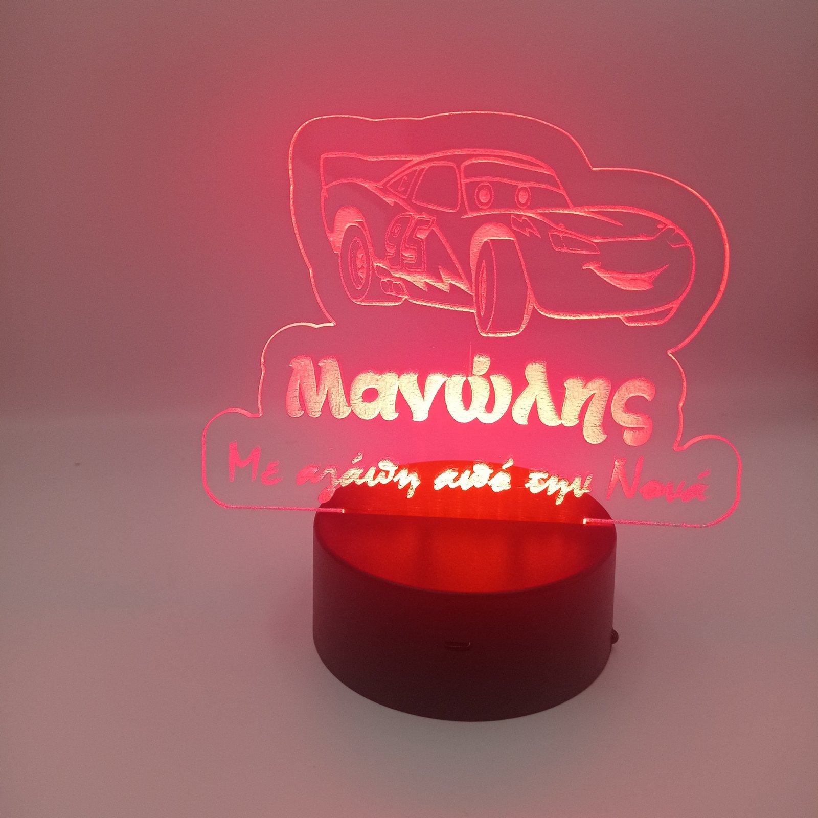 Επιτραπέζιο φωτιστικό plexiglass με πλαστική βάση, McQueen με όνομα και αφιέρωση. Υπάρχει δυνατότητα επιλογής 8 χρωμάτων. Στείλτε μας το σχέδιο που θέλετε, και εμείς θα σας το κάνουμε φωτιστικό με το όνομα και την αφιέρωση που επιθυμείτε. Σε μεγάλες παραγγελίες οι τιμές διαμορφώνονται ανάλογα. Επικοινωνήστε τηλεφωνικά.