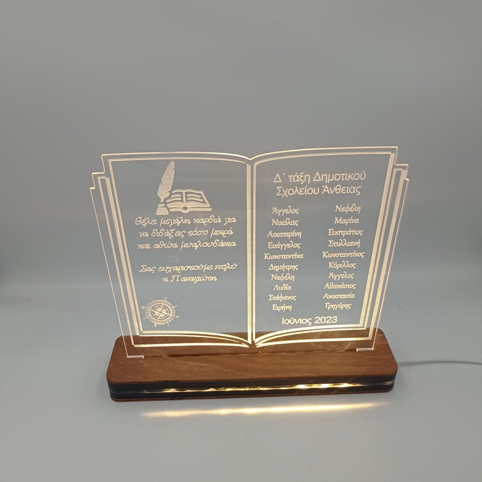 Φωτιστικό βιβλίο σε ξύλινη χειροποίητη βάση, με τα ονόματα των μαθητών την τάξη και την αφιέρωση της επιλογής σας.