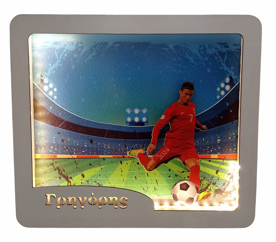 Επιτοίχιο ξύλινη κορνίζα φωτιστικό με διακόπτη μπαταρίας , ποδόσφαιρο με το όνομα τις επιλογής σας. Στείλτε μας το σχέδιο που θέλετε, και εμείς θα σας το κάνουμε φωτιστικό με το όνομα που επιθυμείτε. Σε μεγάλες παραγγελίες οι τιμές διαμορφώνονται ανάλογα. Επικοινωνήστε τηλεφωνικά. Διάσταση 35εκ μάκρος.