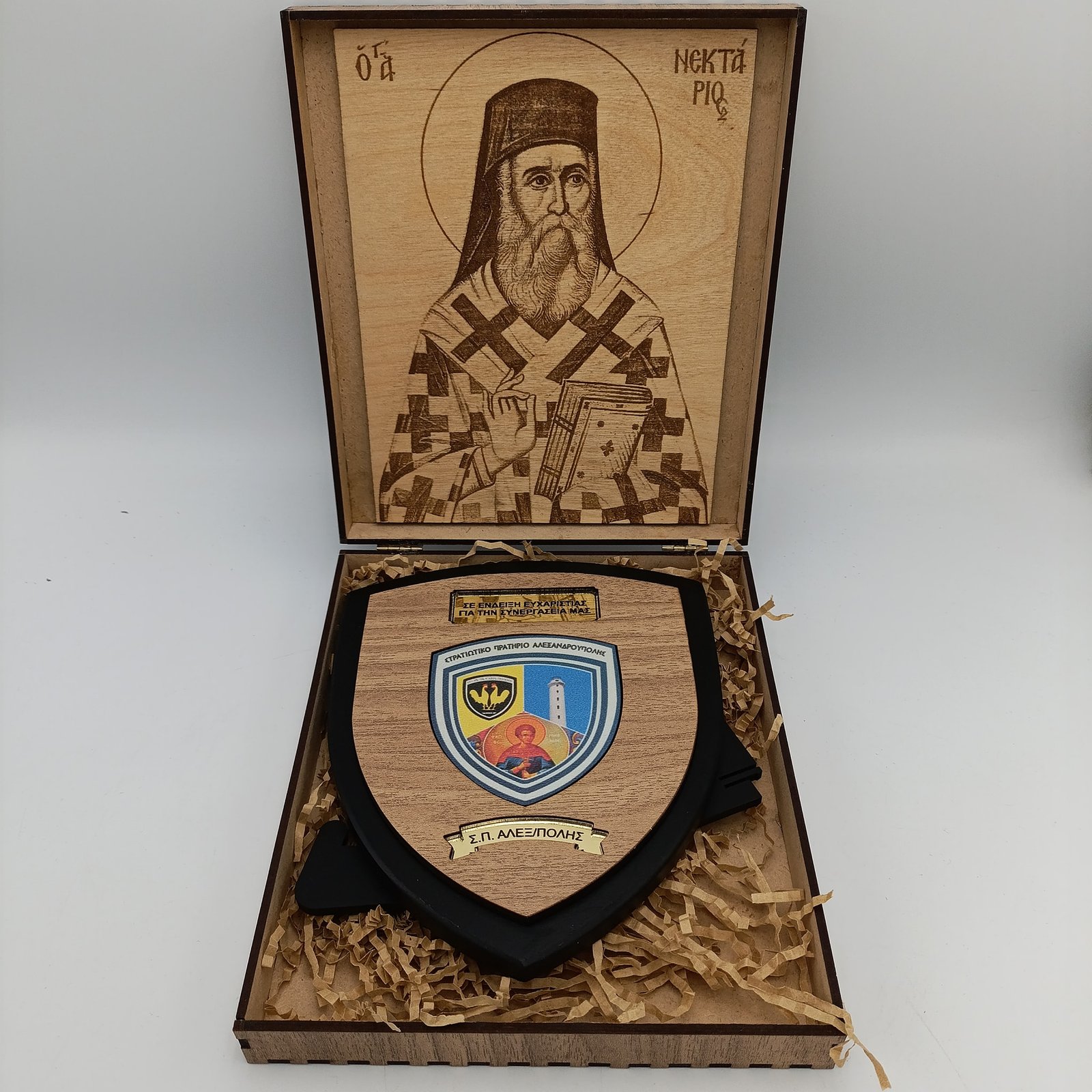 Ξύλινη πλακέτα με έγχρωμη εκτύπωση και σκαλιστή εικόνα αγίου με χρυσά στοιχεία μονάδας και αφιέρωσης.Με ξύλινο κουτί με το λογότυπο σας και την αφιέρωση τη ς επιλογής σας. Επίσης περιέχει ξύλινη βάση και κρεμαστράκι.