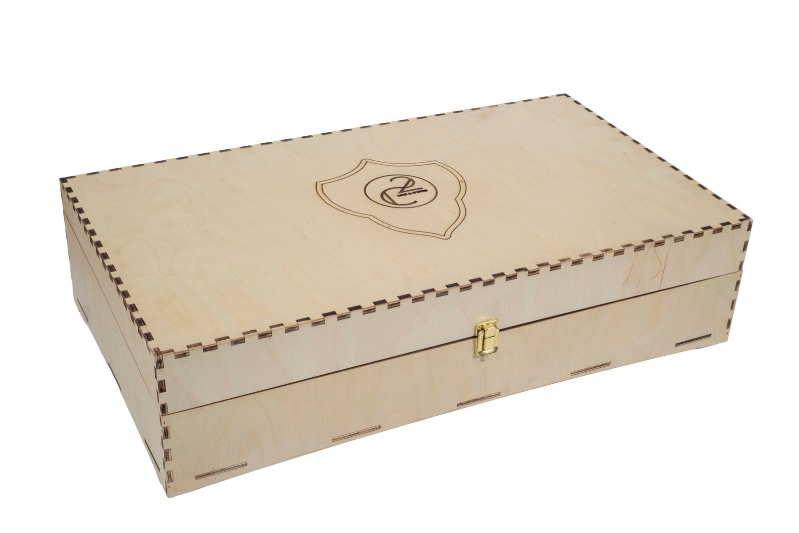 Ξύλινο κουτί 6πλης φιάλης με μεταλλικό κλείστρο στο καπάκι. Φτιαγμένο από συμήδα υψηλής ποιότητας 4mm. Στο καπάκι μπορεί να χαρακτεί το λογότυπο σας ή το λογότυπο του πελάτη σας.